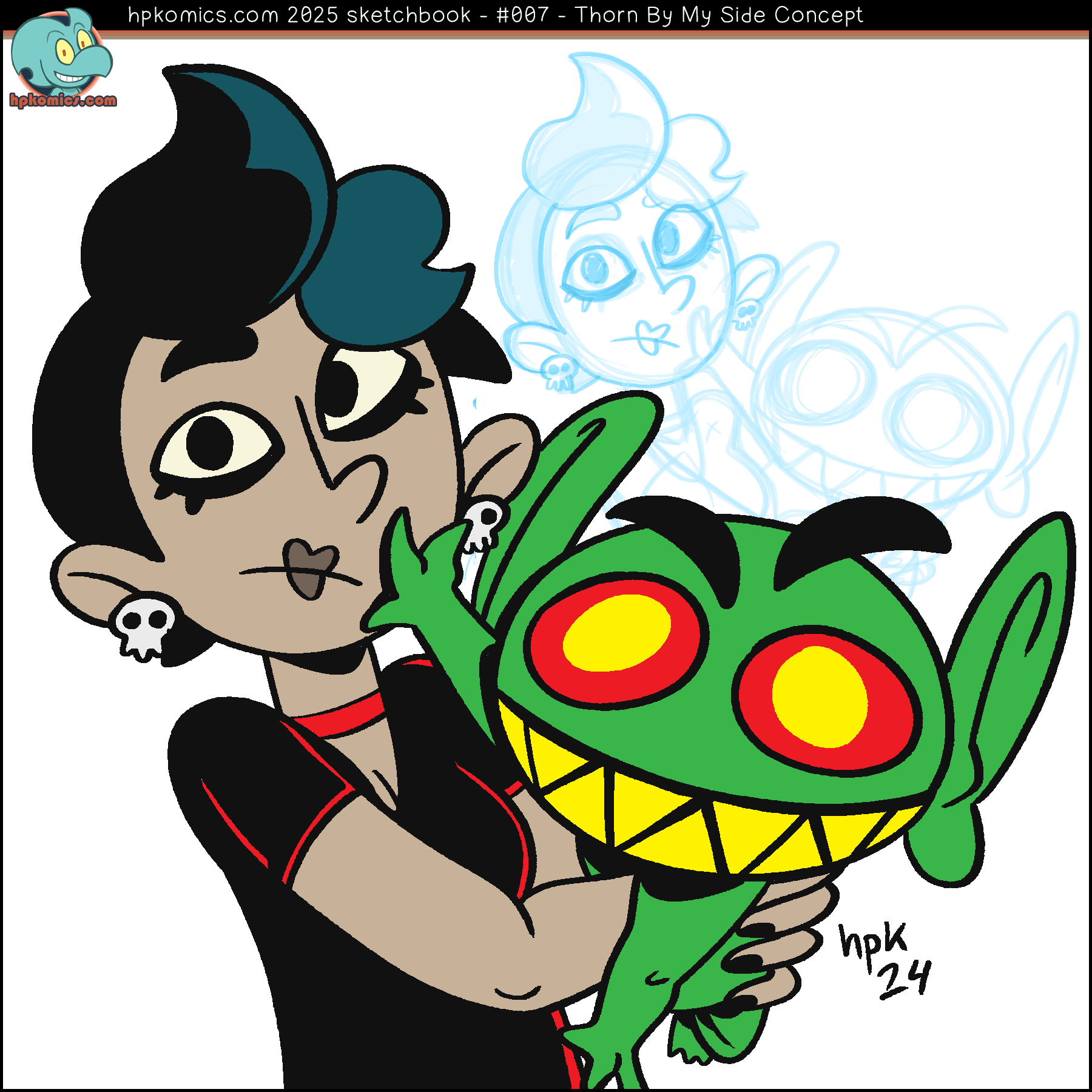 Today’s sketchbook update is just a drawing of a terminally over-employed elder millennial goth and her assigned emotional support goblin.