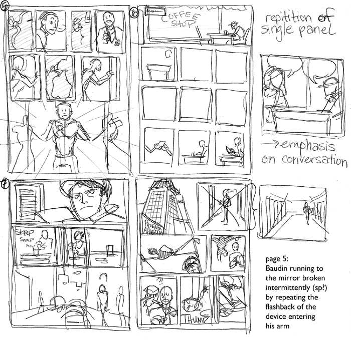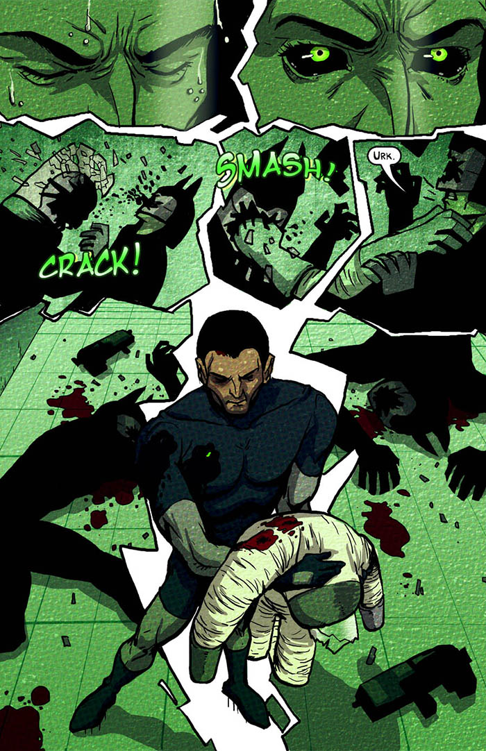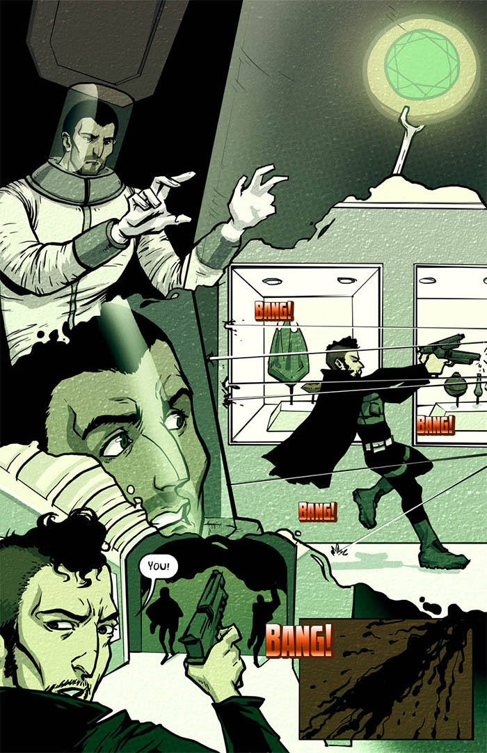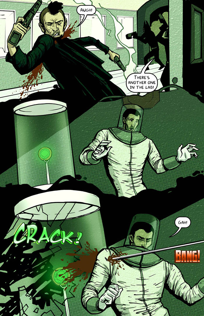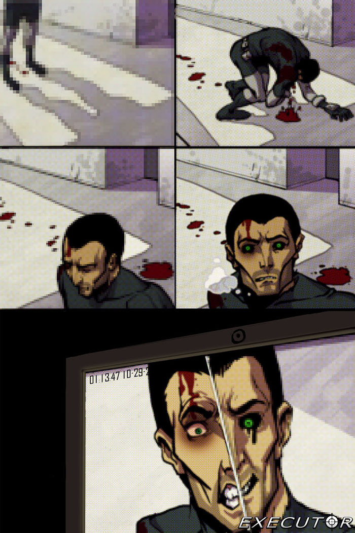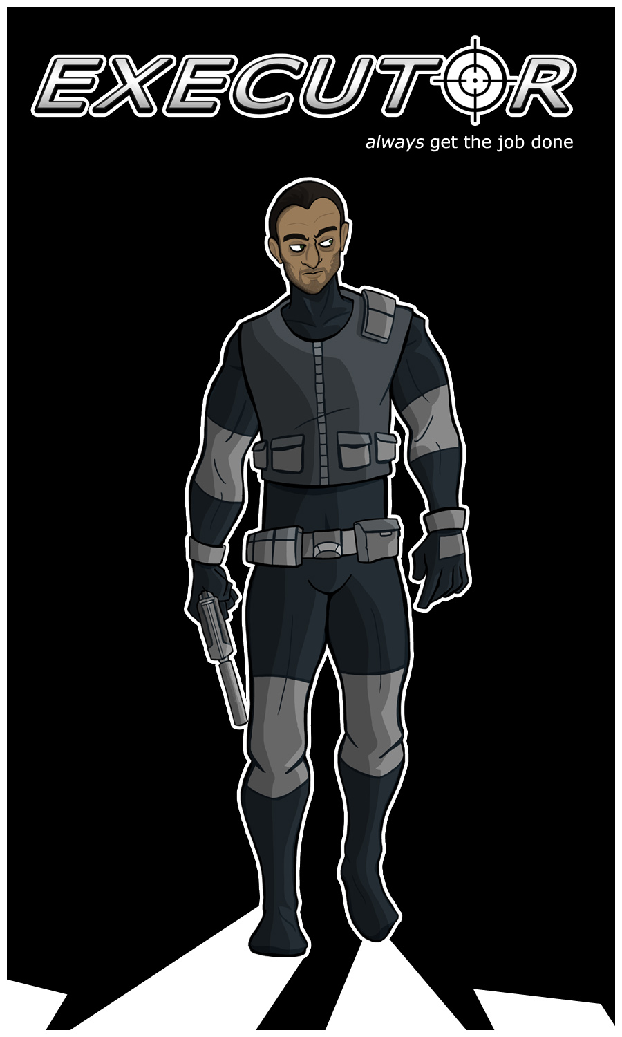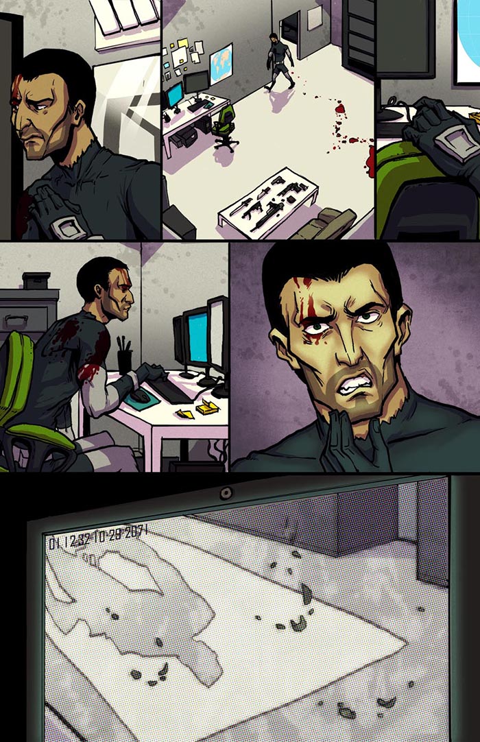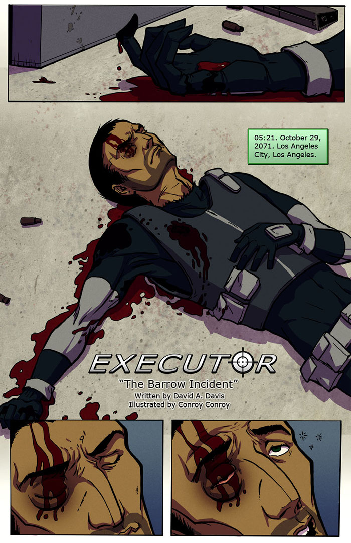The comic pitch is a cyberpunk espionage series. It is set in a dystopian future run by a handful of multinational corporations. Instead of wars, these corps strike at one another by hiring mercenaries to engage in subterfuge and terrorism. Soldiers are contractors who work for one corp, while Executors are those who work anonymously for the highest bidder. The comic followed one specific Executor, Arnaud Baudin, who was on a job where two Executors were hired simultaneously which resulted in a lab accident with dangerous consequences.